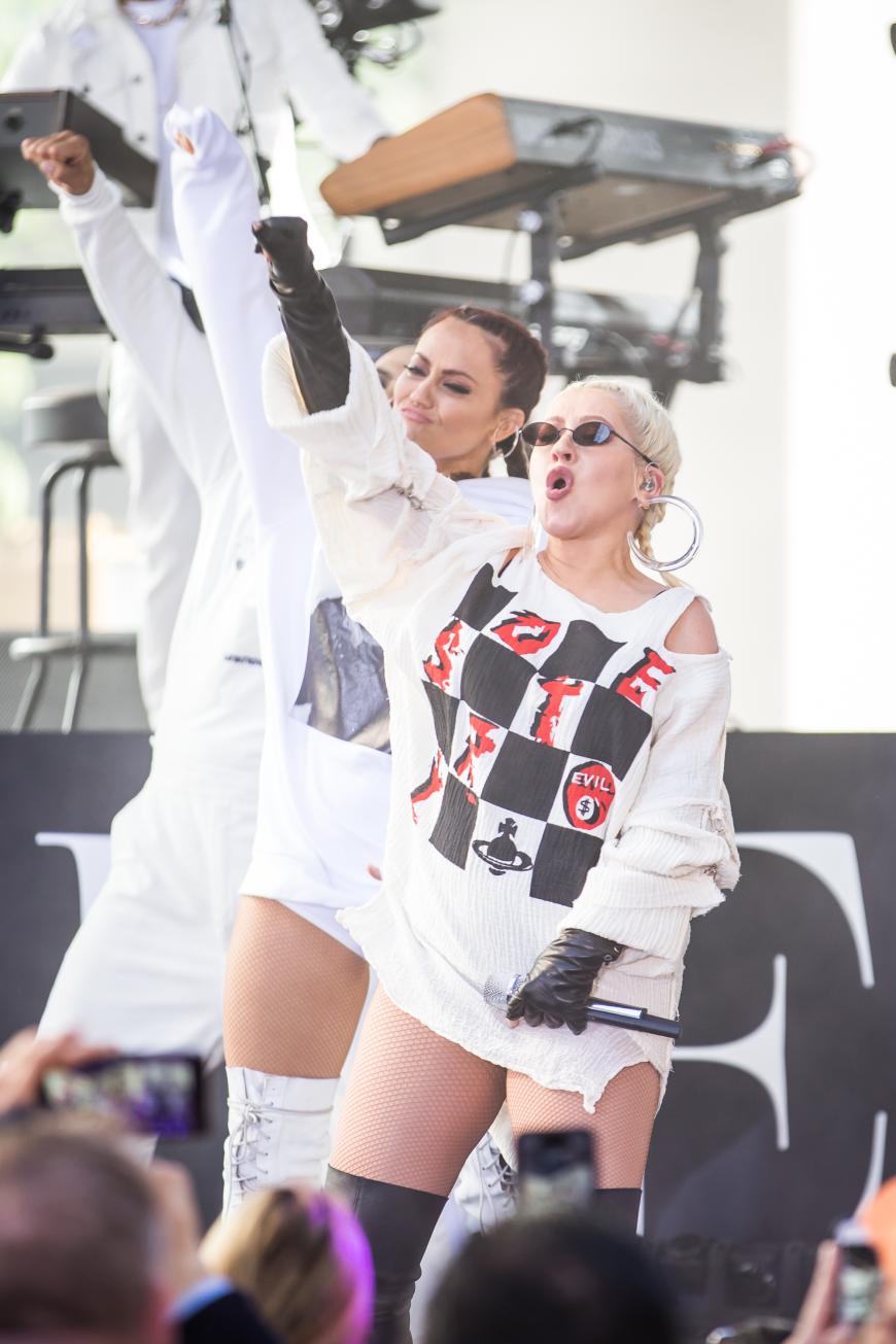 37 year old christina aguilera rocked the stage during her performance at rockefeller plaza in new york city last week while wearing an oversize topdress with fishnets and thigh high boots.