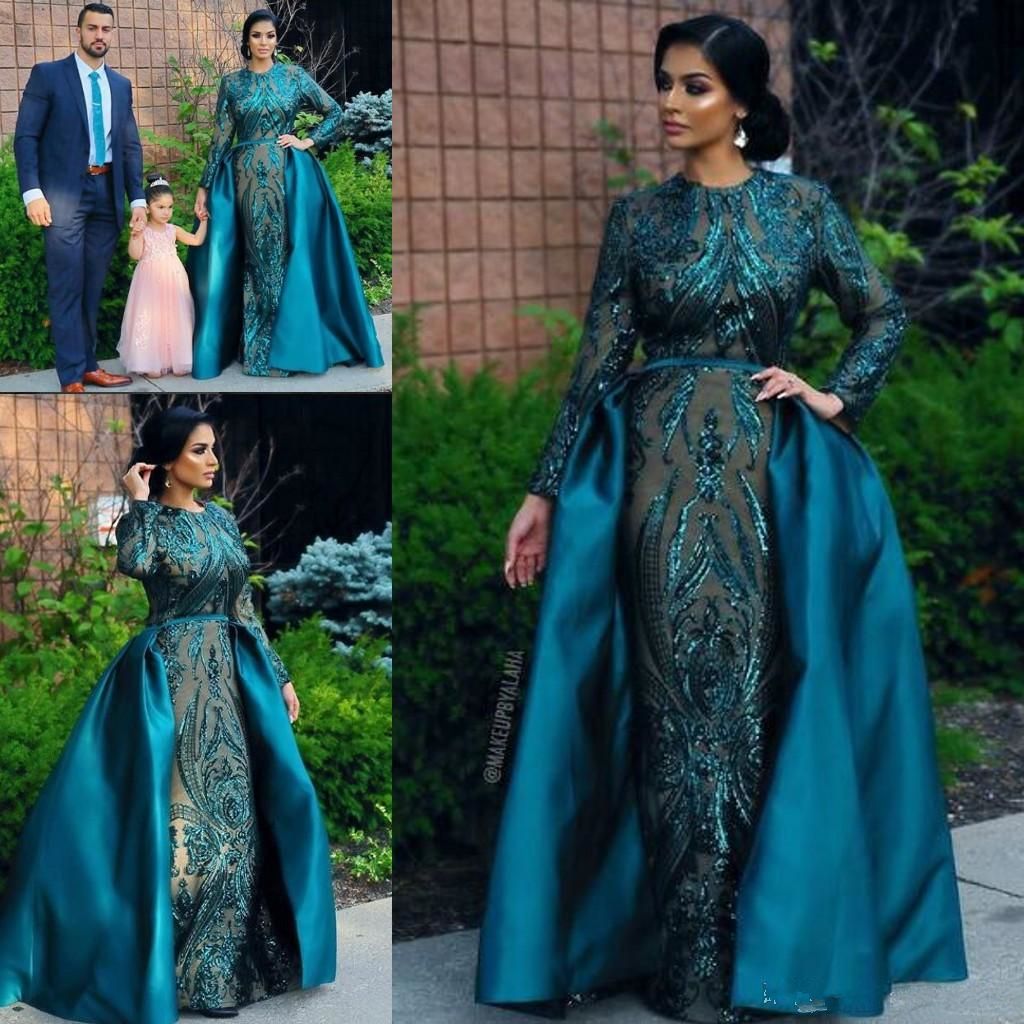 Scarlett Johansson Mermaid Evening Dresses With Detachable Train Sequined Long Sleeve Muslim Arabic Prom Gowns Formal Party Dress
